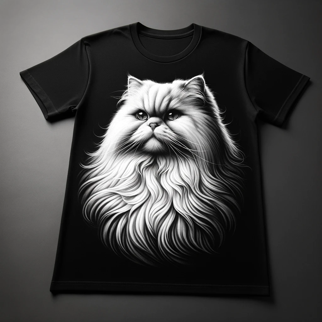 Embrace elegance with our Black T-Shirt featuring a majestic white Persian cat. The realistic depiction of this regal feline against the classic black background adds sophistication to your look. Perfect for those who appreciate the finer things in life, it’s a must-have for any chic wardrobe.